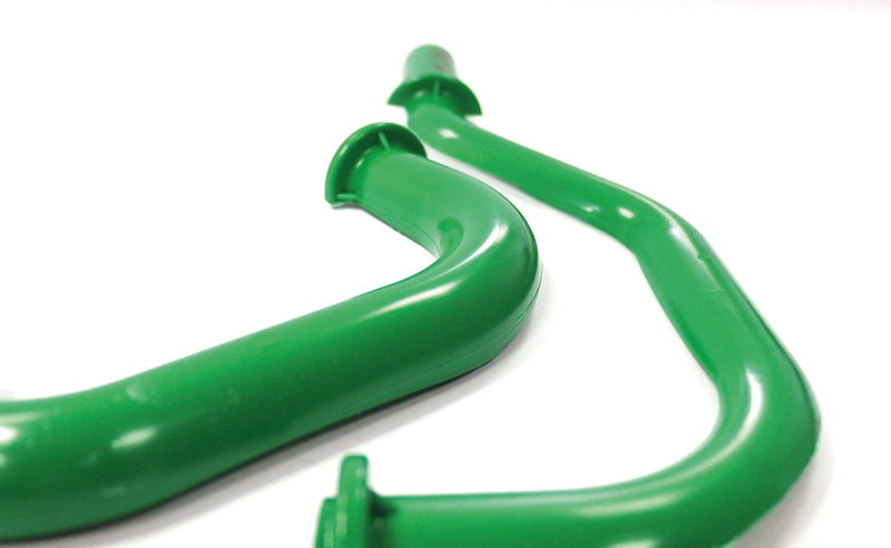 AKROMID® A3 GM 20/10 4 WIT black (4529) is also suitable for production of pipes with diameters greater than 30 mm. Projectile injection (PIT) was developed because physical properties dictate that the residual wall thickness of components increases as the diameter increases (rule of thumb: the residual wall thickness of the pipe is 1/8 – 1/10 of the outside diameter). With this technique the component is partially or completely filled, and the melt is then expelled from the cavity by means of a projectile made of plastic or metal. PIT is a suitable method particularly when the geometry, especially that of the cross section shape, is similar across the component. Slight changes in cross section can be handled using variable projectiles, but larger ones cannot. The advantage of PIT is that the thinnest residual wall thicknesses can be achieved with this method variant.
